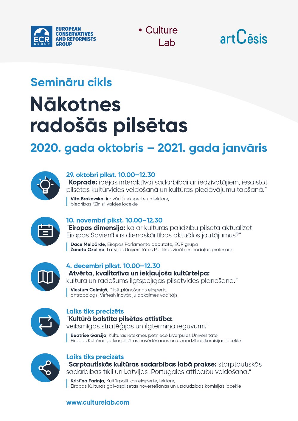 2020.gada 23.septembrī noritēja starptautisks seminārs-domnīca “Eiropas kultūras galvaspilsēta Latvijā 2027”, bet tam sekojošie tiešsaistes semināri primāri veidoti, lai atbalstītu pašvaldību komandas, kuras gatavo pirmās kārtas pieteikumu sacensībā par Eiropas Kultūras galvaspilsētas godu. Vienlaikus tie ir noderīgi un atvērti visiem, kuri vēlas gūt informāciju par mūsdienīgu un ilgtspējīgu pilsētu kultūras attīstības plānošanu, veidojot jaunās novadu attīstības stratēģijas. Semināru norise plānota no 2020.gada oktobra un turpināsies 2021.gadā.