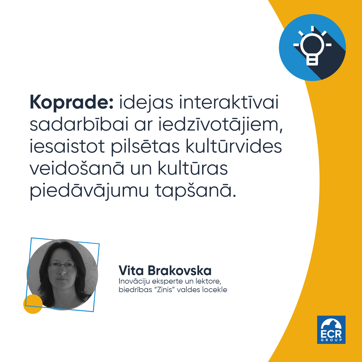 Pirmais tiešsaistes seminārs “Koprade: idejas interaktīvai sadarbībai ar iedzīvotājiem, iesaistot pilsētas kultūrvides veidošanā un kultūras piedāvājumu tapšanā”plānots 29.oktobrī no pulksten 10.00 līdz 12.30 . Seminārs ir veltīts vienai no Eiropas kultūras galvaspilsētas centrālajām tēmām – sabiedrības līdzdalībai, kam būtiska loma gan pieteikuma koncepcijas veidošanā, gan programmas izstrādē, programmas ideju izplatīšanā un praktiskajā ieviešanā ar brīvprātīgo kustības un “vēstnešu” starpniecību, vēršot plašumā projekta tradicionālo ietekmes telpu. Semināru vadīs inovāciju eksperte un lektore, biedrības “Zinis” valdes locekle Vita Brakovska. Viņaizmantos praksē balstītus piemērus un rosinās dalībniekus izstrādāt risinājumus, lietojot daudzveidīgas vietējās kopienas iesaistes metodes, kas palīdz rast atbildes uz jautājumiem: