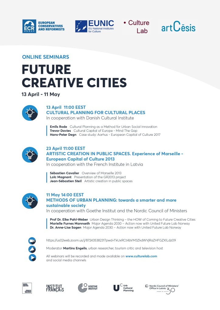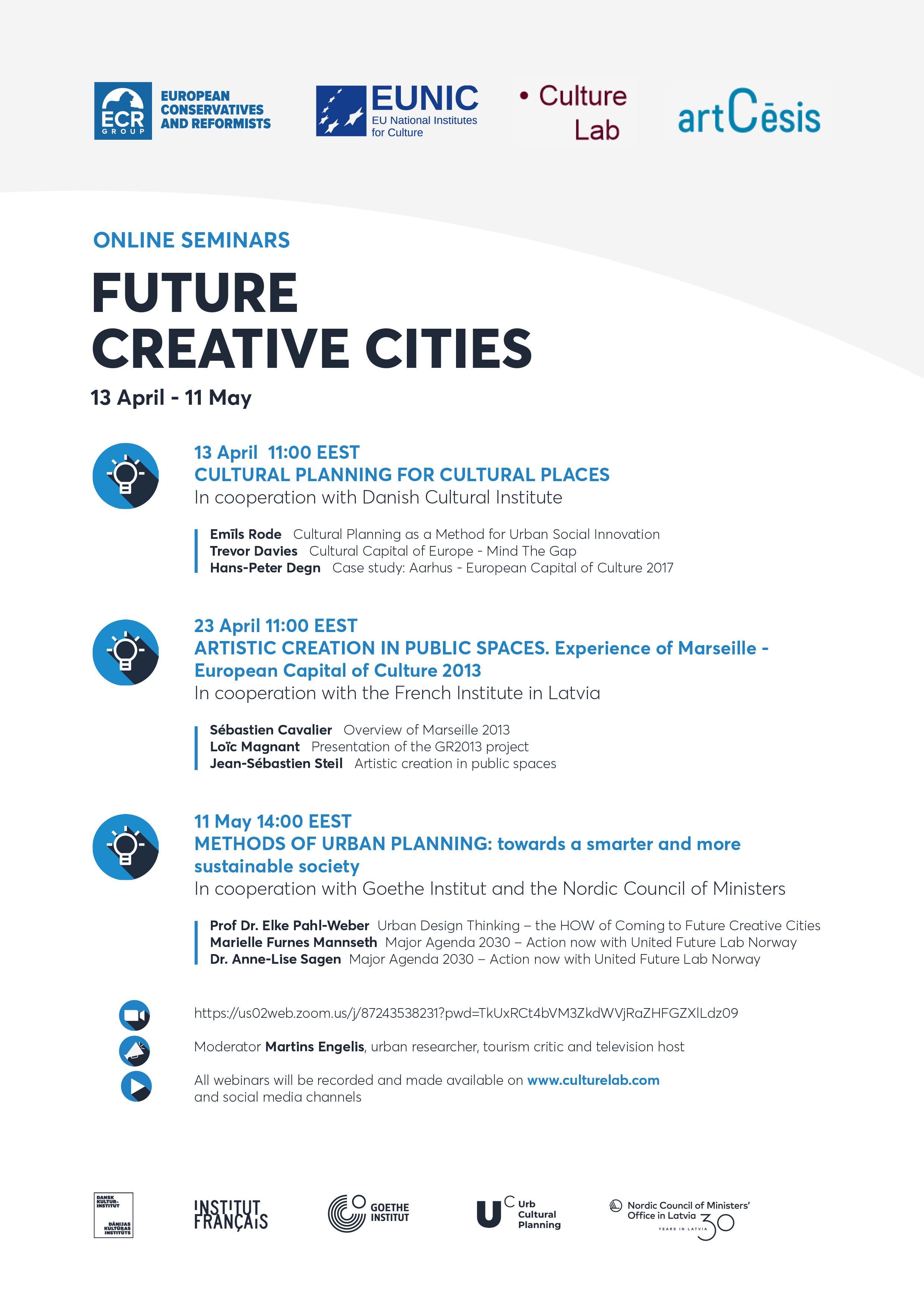 Esam priecīgi turpināt webināru ciklu “Nākotnes radošās pilsētas”. Mūsu sadarbības partneru lokam piepulcējies EUNIC-Latvia kultūras institūtu tīkls un turpmākajos mēnešos piedāvāsim Jums 3 interesantas tēmas un 9 pieredzes bagātus, saistošus runātājus no Dānijas, Francijas, Vācijas un Norvēģijas.