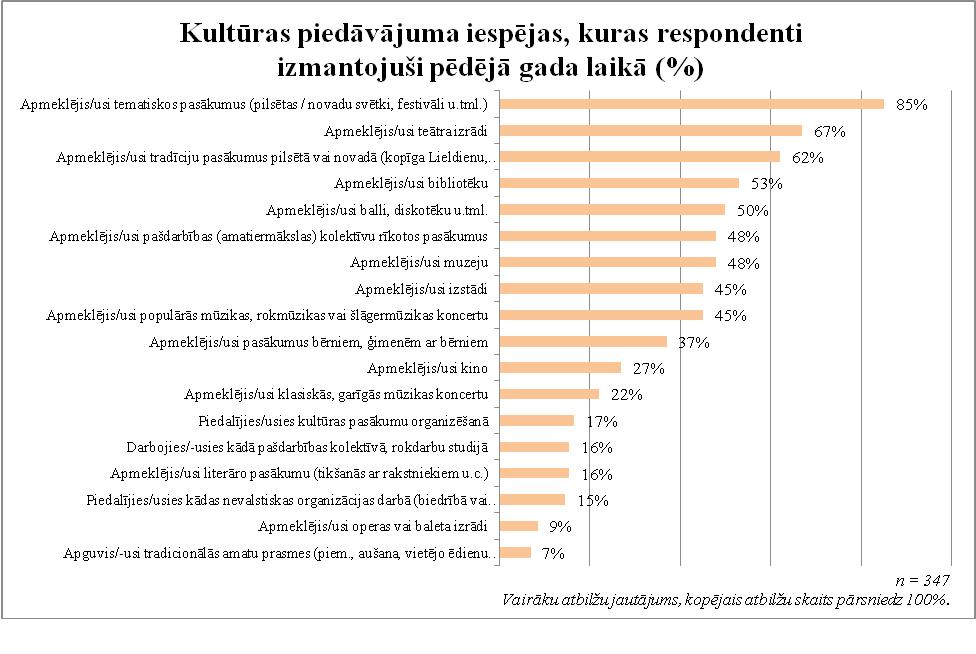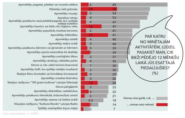 Pētījuma datu analīze liecina, ka kultūras pasākumus un aktivitātes Latvijā apmeklē daudzi iedzīvotāji, bet dara to reti. Kopumā ir liels to iedzīvotāju īpatsvars (93%), kuri vismaz reizi gadā dodas uz kādiem kultūras pasākumiem, bet mazs to īpatsvars, kuri pasākumus apmeklē regulāri. Samērā augsts ir arī vidējais aktivitāšu skaits – vidēji viens Latvijas iedzīvotājs gada laikā piedalās 8,9 no 25 anketā iekļautajām kultūras aktivitātēm. Ņemot to vērā, kultūras pasākumu un aktivitāšu auditorijas palielināšanā lielākas iespējas varētu dot apmeklējumu regularitātes sekmēšana, nevis neaktīvās auditorijas ieinteresēšana un aktivizēšana.