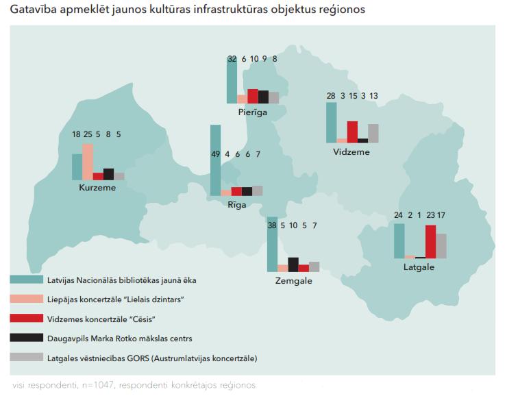 Pēdējo gadu laikā Latvija ir bagātinājusies ar vairākiem jauniem kultūras infrastruktūras objektiem reģionos (koncertzāles Cēsīs un Rēzeknē (topoša – Liepājā), muzejs Daugavpilī, bibliotēka Rīgā) – tas rada jaunus izaicinājumus tiem tuvākajos gados kļūt par nozīmīgiem kultūras centriem reģionos, aktivizējot un piesaistot auditoriju kā no tuvākas, tā tālākas apkārtnes. Visbiežāk iedzīvotāji kultūras pasākumus apmeklē savā dzīvesvietā (81%), bet vairāk nekā puse (58%) Latvijas iedzīvotāju vismaz reizi gadā dodas uz kultūras pasākumiem galvaspilsētā, bet tikai 43% – uz pasākumiem savā reģionā. Tas nozīmē, ka šobrīd Rīga ir būtiskākais kultūras pasākumu un aktivitāšu centrs – iedzīvotāji, kuri visbiežāk pasākumus apmeklē ārpus savas dzīvesvietas, parasti dodas uz Rīgu, nevis citu apdzīvotu vietu savā reģionā vai novadā. Tas ļauj izvirzīt jautājumu, vai un kā kultūras patēriņu reģionos ietekmēs jaunie kultūras infrastruktūras objekti. Šobrīd iedzīvotāju interese par tiem nav izteikti liela. Lai gan kultūras infrastruktūras objektus atpazīst salīdzinoši daudz iedzīvotāju, tos apmeklēt tuvākā gada laikā ir gatavi un ieinteresēti nedaudzi. Piemēram, lai gan Vidzemes koncertzāli „Cēsis” zina 35% iedzīvotāju, tikai 7% izsaka ieinteresētību to apmeklēt tuvākā gada laikā.