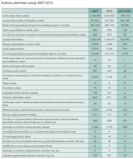 Statistikas dati liecina, ka laika periodā no 2007. līdz 2013. gadam iedzīvotāju skaits Latvijā kopumā samazinājies par 8% jeb 185 015 cilvēkiem, attiecīgi samazinoties arī kultūras pasākumu un aktivitāšu potenciālajai auditorijai. Tai pat laikā ne visas kultūras jomas piedzīvojušas būtisku aktivitāšu samazinājumu un vairākās novērojams pat ievērojams pieaugums. Visbūtiskāk audzis Latvijas Nacionālās bibliotēkas lasītāju skaits – kopējais pieaugums veido 315%, lasītāju skaitam pieaugot no 81 363 2007. gadā līdz 256 189 personām 2013. gadā. Par aptuveni 1/5 pieaudzis radio raidorganizāciju programmu kopējais ilgums stundās. Tāpat audzis teātru apmeklējumu skaits (+16%), palielinoties attiecīgajā periodā no 860 000 līdz 994 000. Aptuveni par 1/10 augusi aktivitāte vēl vairākās jomās – pieaudzis ar kultūras centriem nesaistīto mākslinieciskās pašdarbības kolektīvu skaits, lasītāju skaits bibliotēkās, muzeju apmeklējums, kā arī izrāžu skaits teātros un TV raidorganizāciju programmu kopējais ilgums stundās. Jāuzsver, ka, neskatoties uz arvien plašāku elektronisko masu mediju satura piedāvājumu un pieejamību, iedzīvotāju ieradumi un vēlme apmeklēt teātrus, muzejus un arī kino nav mazinājušies un ir pat nedaudz palielinājušies.
