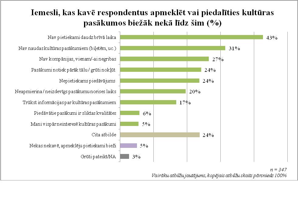 Interesanti, ka iemesli, kāpēc iedzīvotāji neapmeklē kultūras pasākumus būtiski atšķiras atkarībā no respondentu dzīves vietas. Valmierieši, salīdzinot ar citiem iedzīvotājiem, kā galveno kavējošo iemeslu norādīja to, ka nav naudas kultūras pasākumiem (42%), no citām pilsētām Vidzemē kā galvenais kavējošais faktors visbiežāk tika norādīts, ka nav pietiekami daudz brīvā laika (46%), arī novadu, pagastu un ciemu iedzīvotāji uzskata, ka visbiežāk tos kavē apmeklēt vai piedalīties kultūras pasākumos tieši tas, ka nav pietiekami daudz brīvā laika (43%) vai trūkst kompānijas un vienam iet negribas (31%), tāpat mazākās apdzīvotās vietās Vidzemē nozīmīgāks kavējošais faktors ir tas, ka pasākumi notiek pārāk tālu vai grūti nokļūt (28%).
